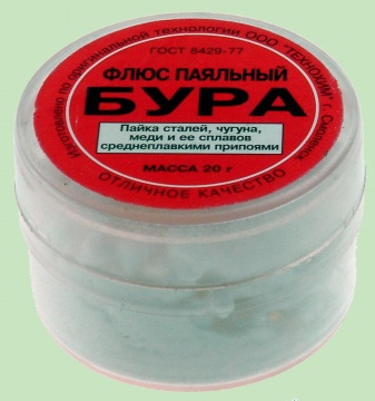 При использовании в качестве флюса буры пайка происходит по реакции CuO + Na2B2O7 = СuО × В2О3 + Na2B2O4. Образовавшаяся смесь легкоплавких солей (СuО × В2О3 и Na2B2O4) плавится при температуре более низкой, чем каждая из них в отдельности. Аналогично происходит пайка при применении буры и борной кислоты и других металлов, окислы которых являются основаниями. Наиболее известные бораты: CuO×B2O3; ZnO × B2O3; 2Fe2O3 × 3B2O3 и др. Таким образом, борная кислота, бура, их смеси, иногда и борный ангидрид используются при пайке преимущественно железа и низкоуглеродистой стали медью, медно-цинковыми и серебряными припоями, а также меди, бронз, томпака, латуней с высокой температурой плавления- медноцинковыми и серебряными припоями при температурах 800-1150ºC