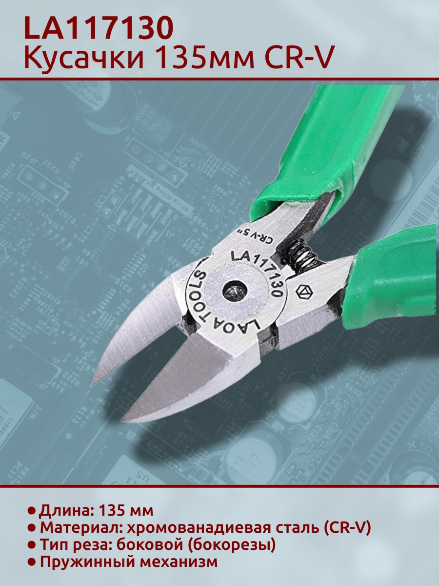 Модель LA117130 подходит как для профессионального использования в сервисных центрах, так и для радиолюбителей. Удобная длина и эргономичная конструкция делают эти кусачки незаменимым инструментом при работе с печатными платами и тонкими проводниками.