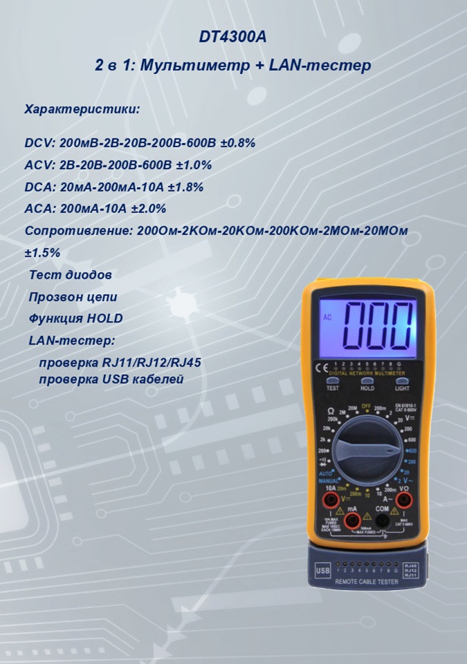 Кроме стандартных функций измерения DCV, ACV, DCA, ACA, сопротивления, он имеет приставку для проверки кабелей типа RJ11, RJ12 , RJ45, USB.
