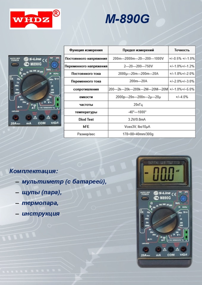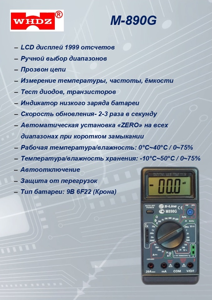 Универсальный цифровой мультиметр M890G с большим LCD и широким набором функций, измерение емкости, температуры, тест диодов, транзисторов, тока, напряжения, сопротивления. Уникальный набор функций в одном приборе измерение RCL (сопротивления, ёмкости, индуктивности). Правила эксплуатации и , как пользоваться прибором мультиметром, вы можете узнать скачав инструкцию.