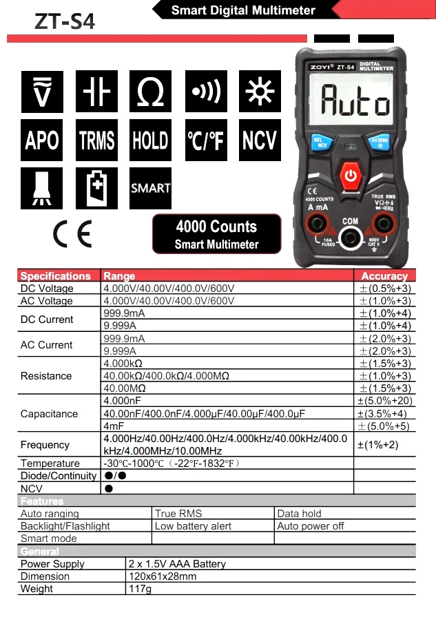 Цифровой мультиметр ZT-S4 Измерительные провода(щупы) Термопара Комплект батареек Руководство пользователя - инструкция |