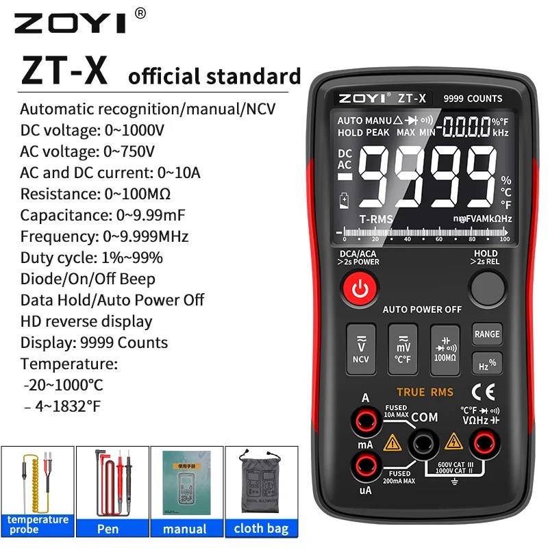 Мультиметр Щупы Датчик температуры Сумка-чехол батарейки Инструкция по эксплуатации ZT-X |