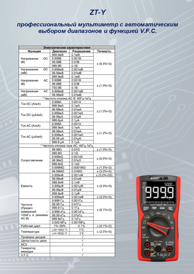 V.F.C функция измерения в цепях преобразователей напряжение-частота VFC ( Voltage-Frequency converter). Это включение в измерительную цепь фильтра, который отсеивает неравномерности и частотные всплески напряжения и, следовательно, измеряется только усредненное значение. Может применяться в цепях инверторов, частотных преобразователей и других источников, использующих ШИМ или цифровой синтез формы напряжения.