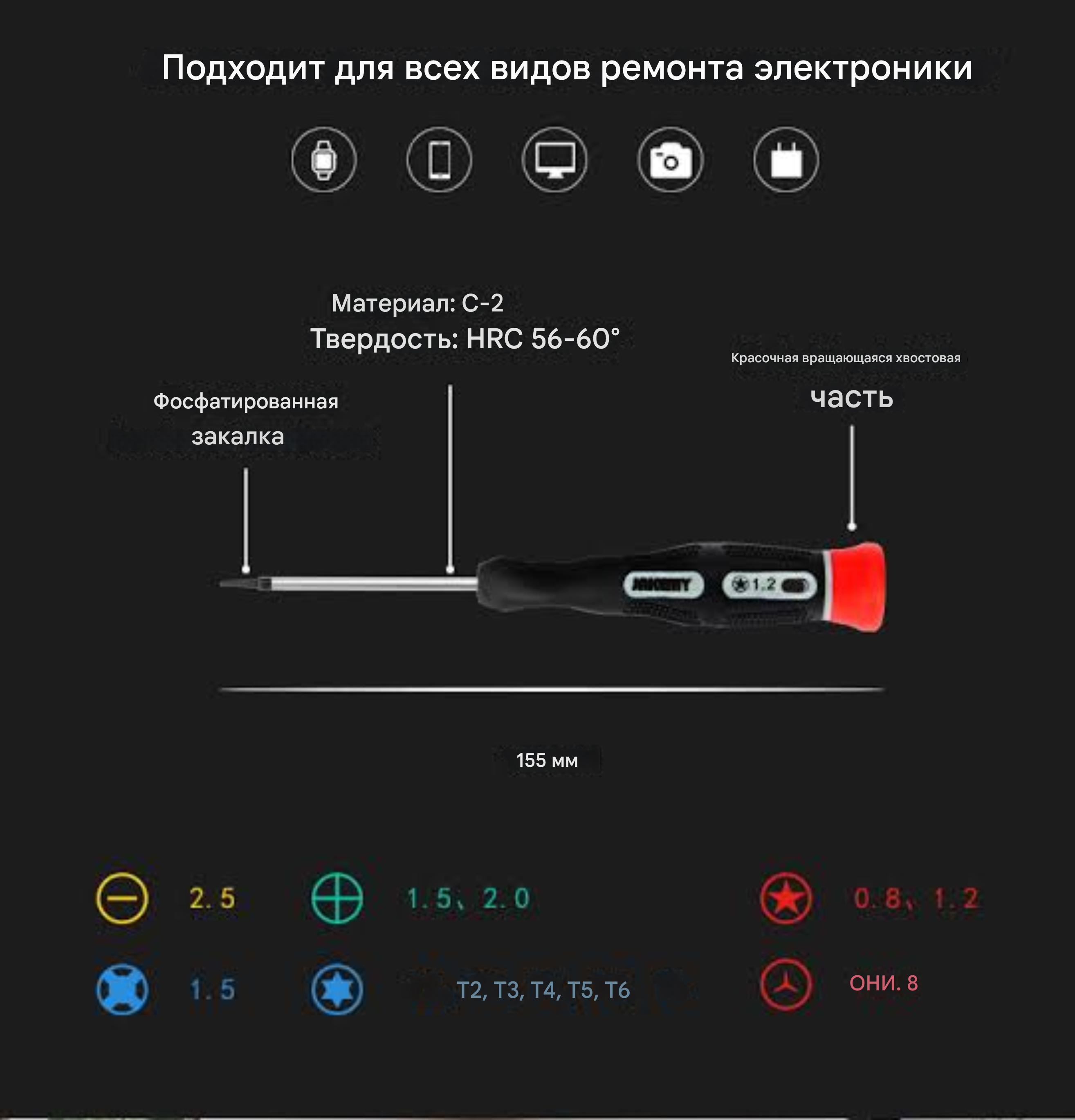Эта отвёртка — незаменимый инструмент для тех, кто работает с мелкой электроникой, бытовой техникой, смартфонами, ноутбуками или собирает мебель.