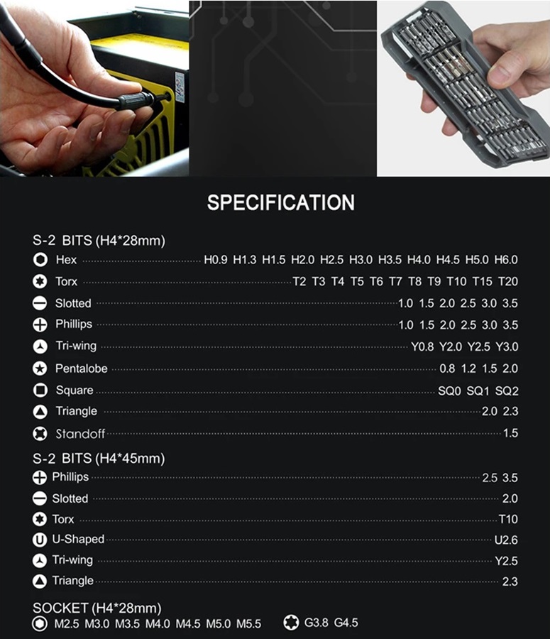 В наборе большое количество бит разного размера и формы, пинцет, удлинитель, присоска для экрана.