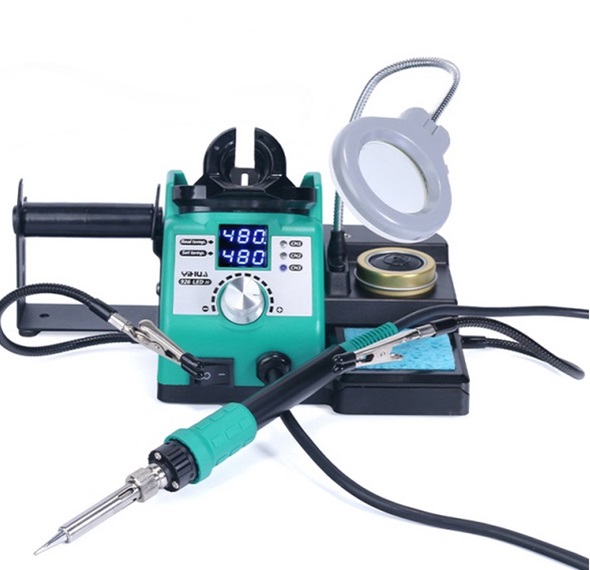 Паяльная станция с паяльником, 5 x различных наконечников жал паяльника (I,B,K,2.4 D,3C), гаечный ключ, бессвинцовая припой 1мм 50 г , набор для чистки (с латунная губка с канифолью), губка для чистки жала паяльника. |