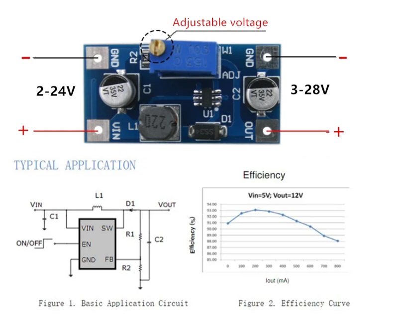 Повышающий преобразователь напряжения DC-DC-Up-SX1308 предназначен для получения регулируемого напряжения от 2 до 24 Вольт, с током нагрузки до 2A от блока питания, батареек, Li-Ion аккумулятора 3.7 В, солнечной батареи, ветрогенератора или ручной динамо-машины.