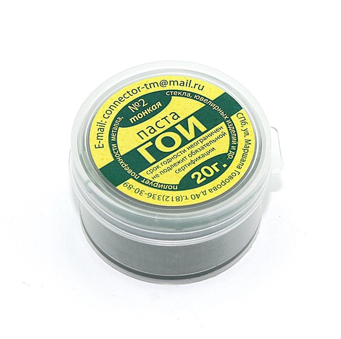 № 2 (паста тёмно-зелёная; абразивная способность 7—1 мкм) для тонкой полировки, придаёт обработанной поверхности зеркальный блеск. Состав: 65—74 частей трёхвалентного оксида хрома, 1 — силикагеля, 10 — стеарина, 10 — расщеплённого жира, 2 — керосина, 2 — олеиновой кислоты, 0,2 — двууглекислой соды;