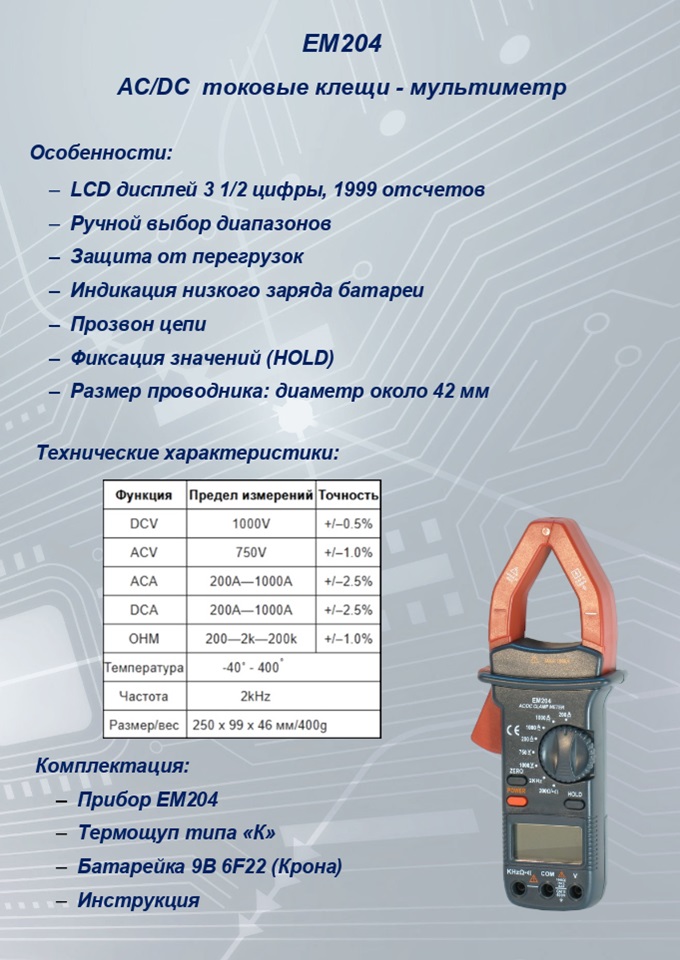 Токоизмерительные клещи (Токовые клещи) EM204 прибор для измерения тока без разрыва цепи, бесконтактным способом, имеет функции мультиметра для измерения сопротивления , напряжения и малых токов. Измерение переменного и постоянного тока до 1000А, функция памяти, измерение частоты, тест диодов, прозвонка цепей. Правила эксплуатации и ,как пользоваться прибором, вы можете узнать скачав инструкцию.