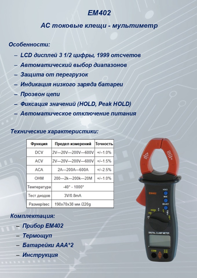 Токоизмерительные клещи (Токовые клещи) EM402 прибор для измерения тока, без разрыва цепи, бесконтактным способом, имеет функции мультиметра для измерения сопротивления , напряжения. Измерение переменного тока до 600А, автоматический выбор диапазонов, функция памяти, звуковая прозвонка, измерение температуры. Правила эксплуатации и ,как пользоваться прибором, вы можете узнать скачав инструкцию.