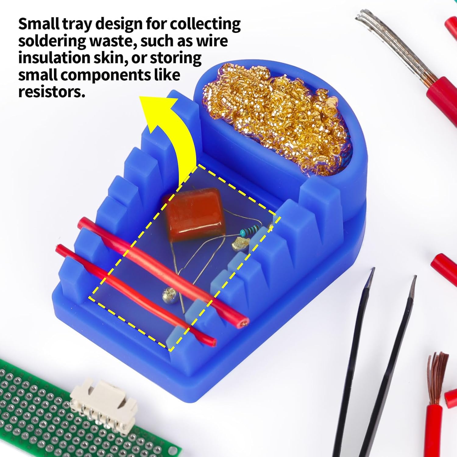 Эта силиконовая подставка для пайки служит в качестве подставки для крепления проводов, включает в себя очиститель для латунной ваты и поддон для сбора проволоки с 6 термостойкими пазами для проводов 32-7AWG.